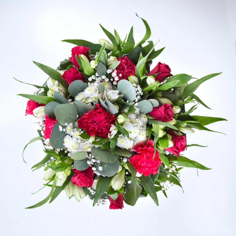 Indulge in the luxury and romantic allure of our Luxurious Romance bouquet. This stunning arrangement features deep red roses and vibrant carnations, paired with sweet white chrysanthemums and airy gypsophila. Enhanced with elegant white alstroemeria and lush aspidistra leaves, it offers a unique and captivating look.